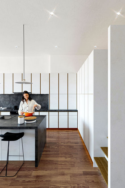 The material selected for the kitchen is a solid textile board, which includes 70 % of recycled fabric in its composition. Its materiality blends perfectly with the modern furniture and the displayed art pieces of the loft.